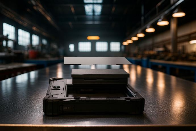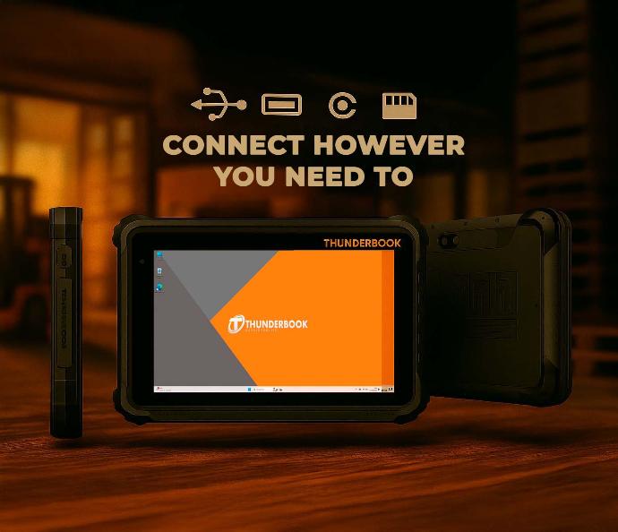 La tablet rugerizada industrial cuenta con USB-C, USB-A, Mini-HDMI, salida de audio, DC-Jack y lector de códigos 1D/2D opcional. Todos los puertos están sellados para cumplir con IP65, garantizando conexión segura en trabajo diario en campo.